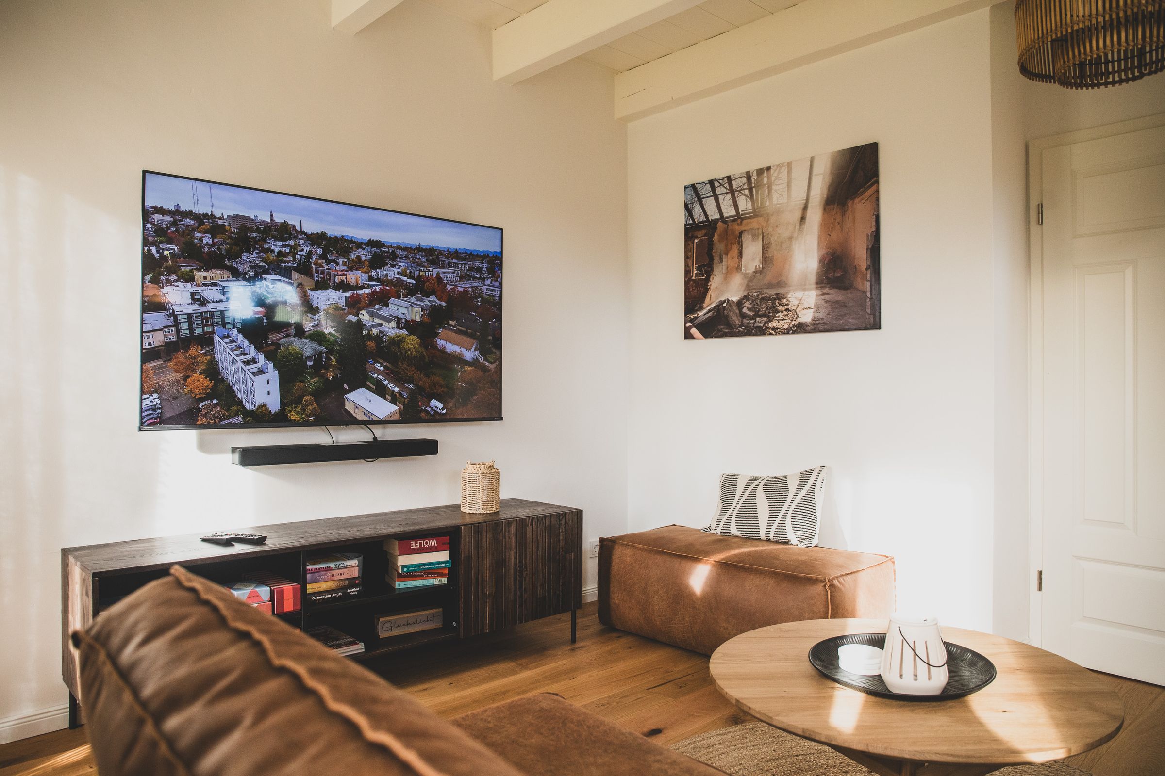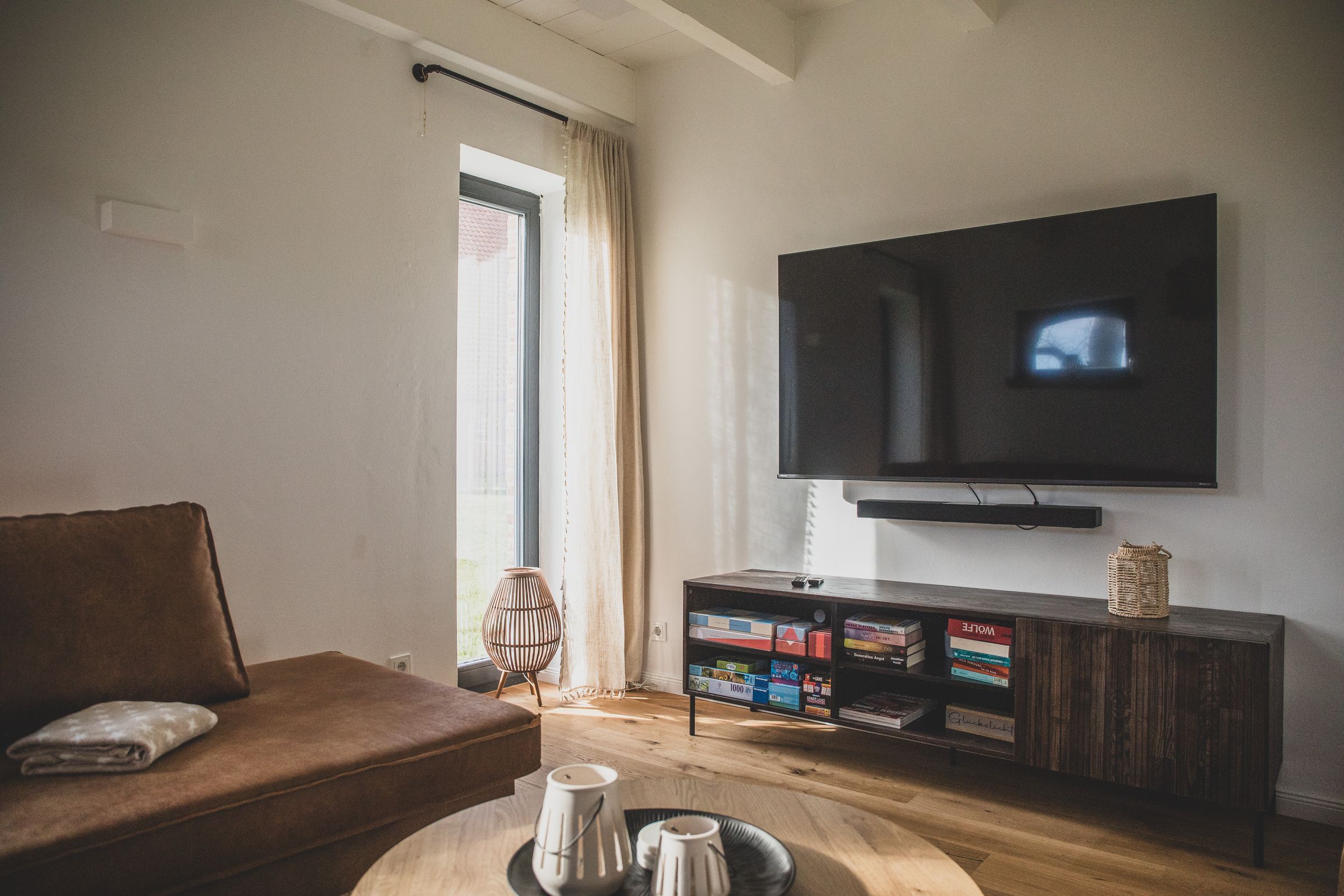 Das Herzstück für alle Film- und Serienliebhaber ist das separate Wohnzimmer, das als privates Kino-Zimmer gestaltetwurde: ein 65-Zoll-TV mit Soundbar sorgt für echtes Heimkino-Feeling – ideal für gemütliche Abende nach einem Tag an der frischen Nordseeluft.