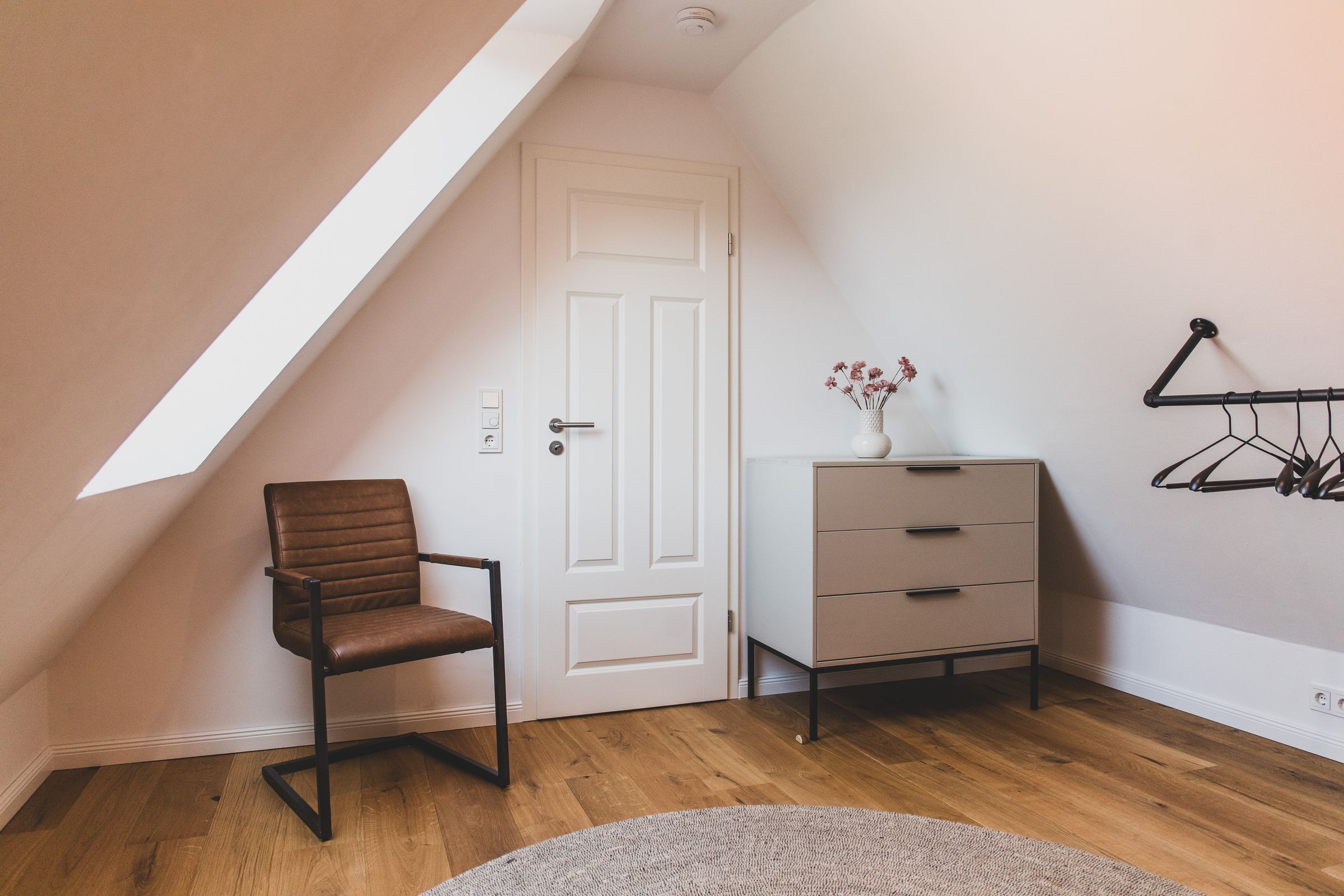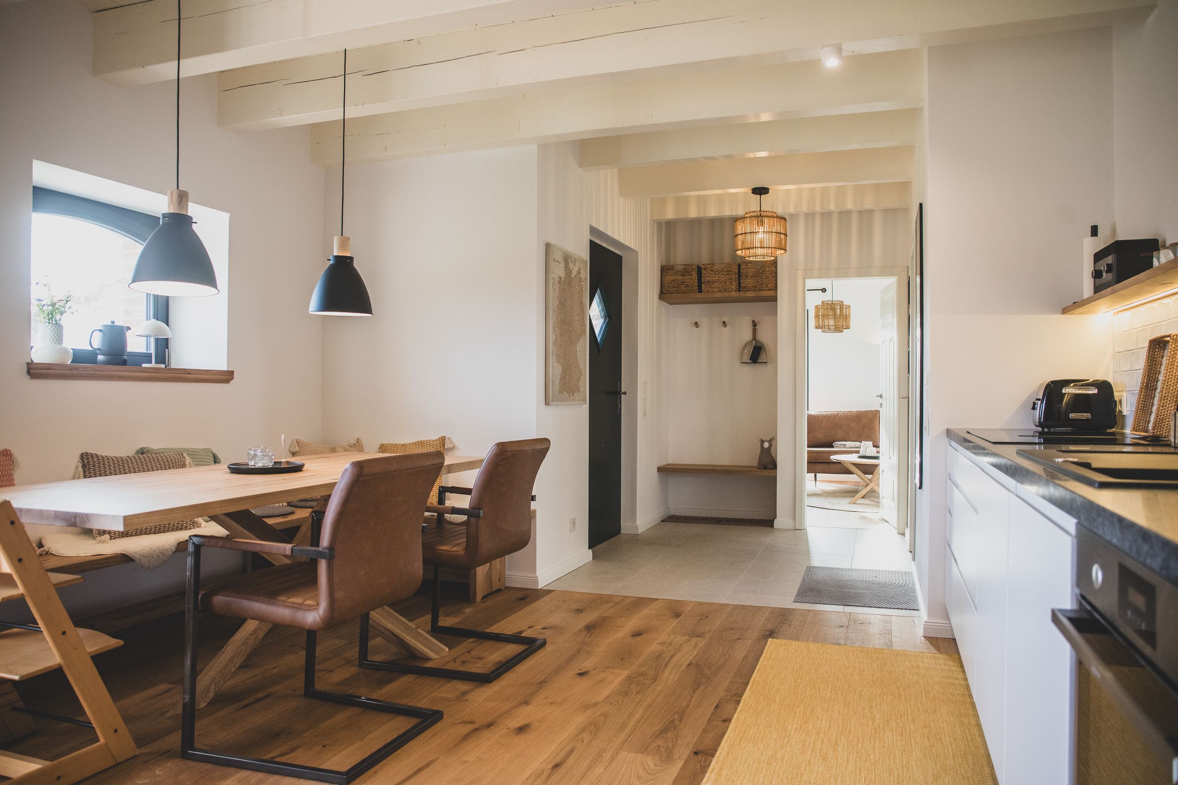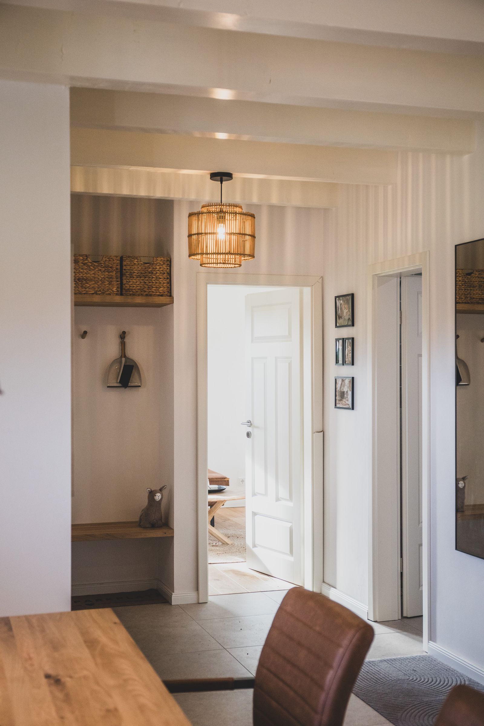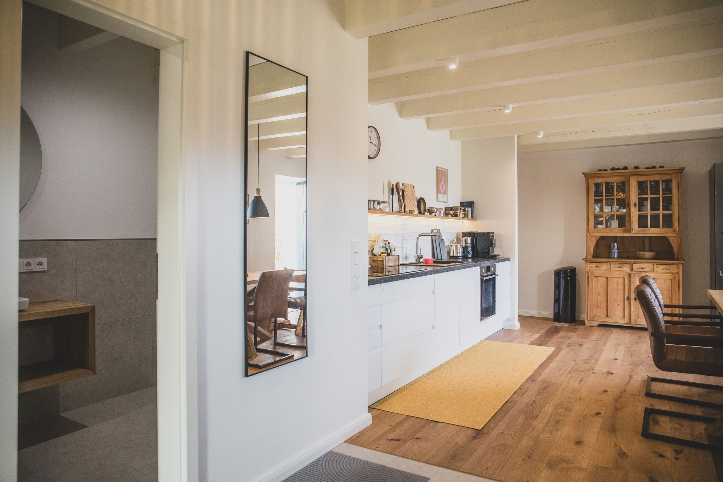 Die Ferienwohnung erstreckt sich über zwei Ebenen und verfügt über einen separaten Eingang, der nicht über die große Eingangshalle des Gulfhofs führt. So genießt ihr zusätzliche Privatsphäre und könnt direkt in euer eigenes Urlaubsreich eintreten.
