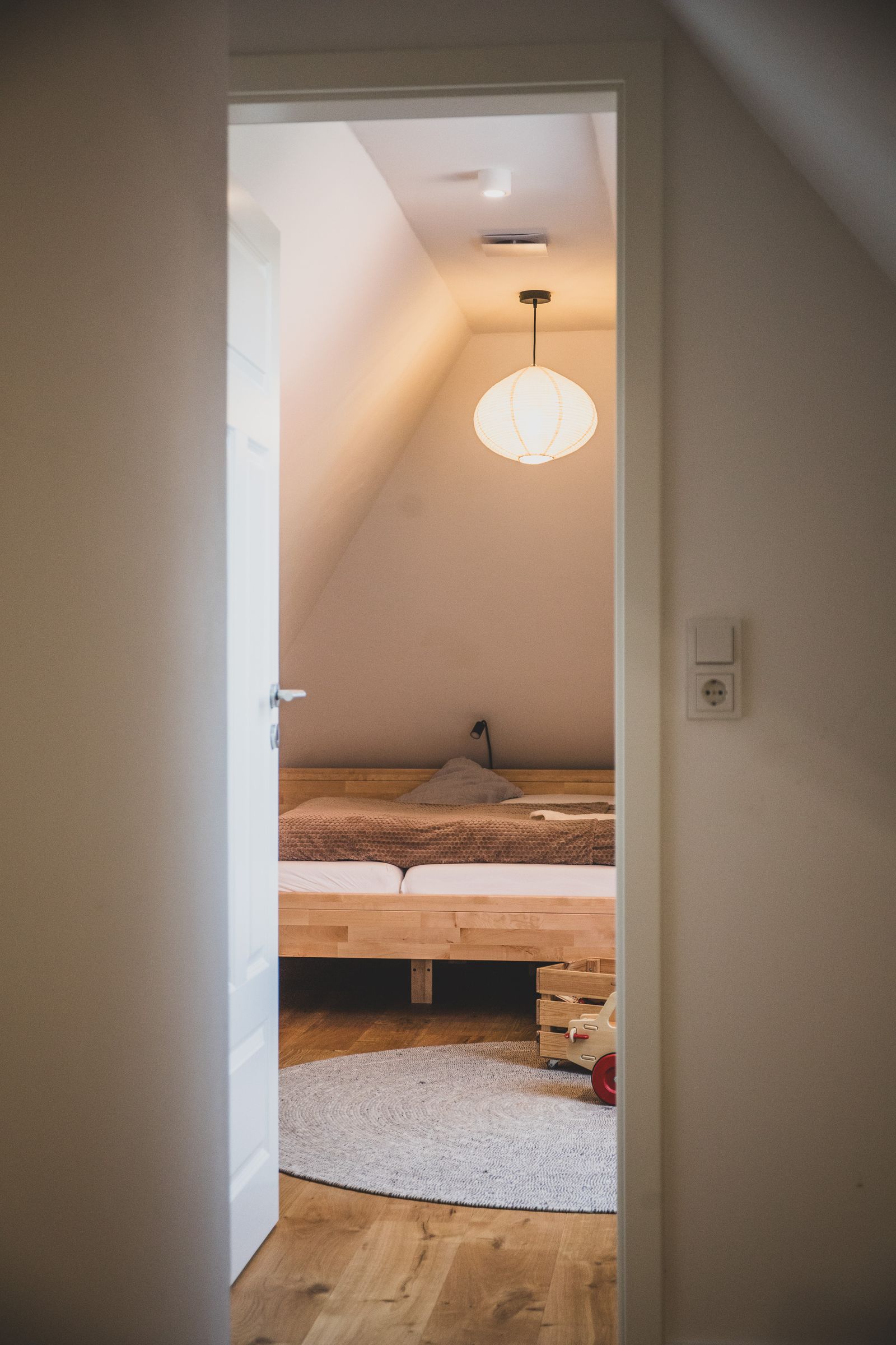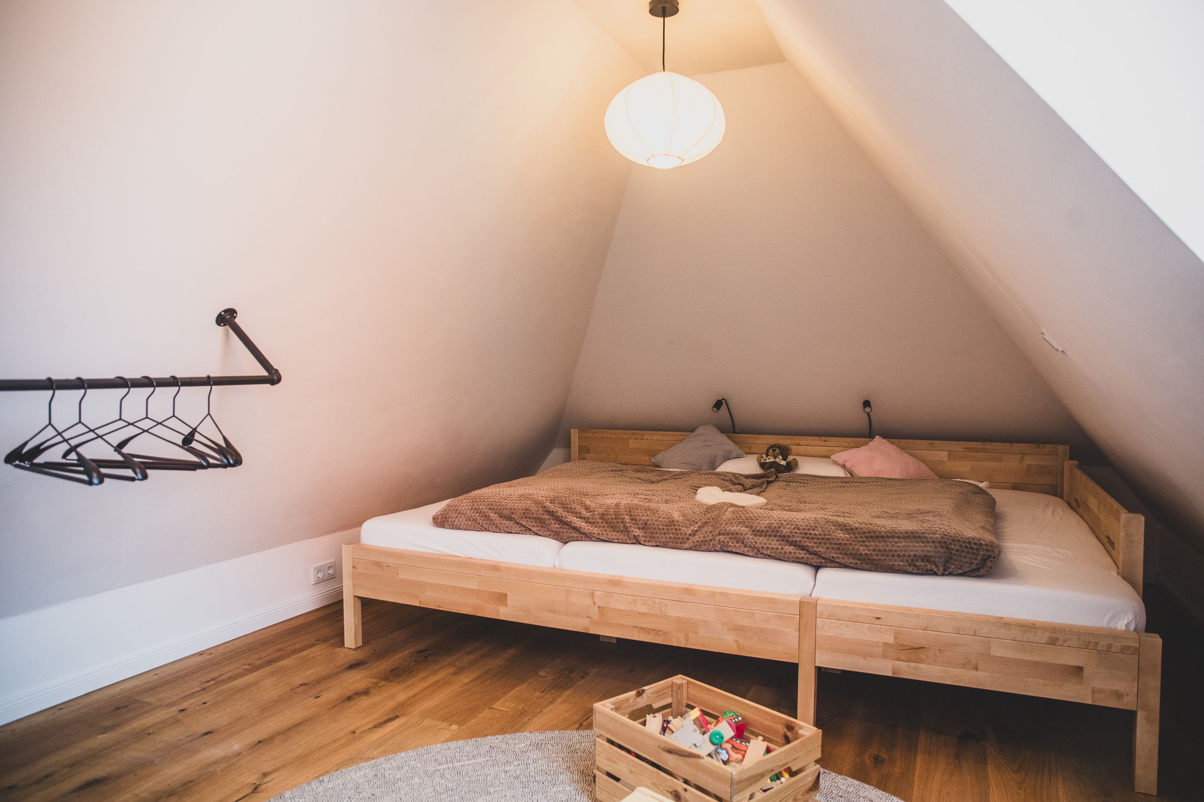 Das erste Schlafzimmer begeistert mit einem echten Highlight: dem riesigen Familienbett (2,70 m breit) – perfekt, um gemeinsam zu kuscheln, zu lesen oder einfach auszuschlafen.