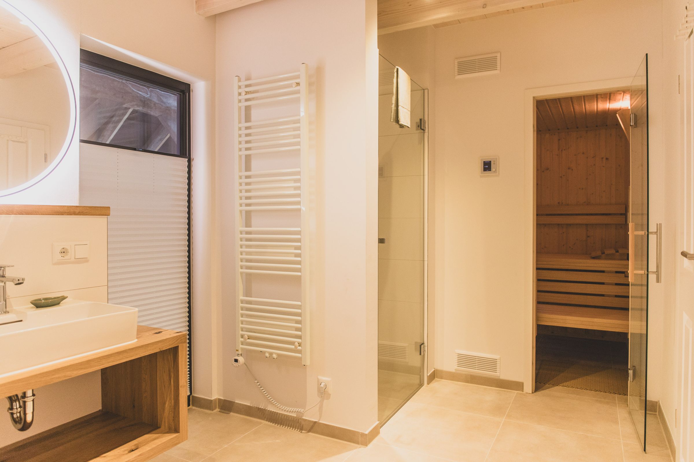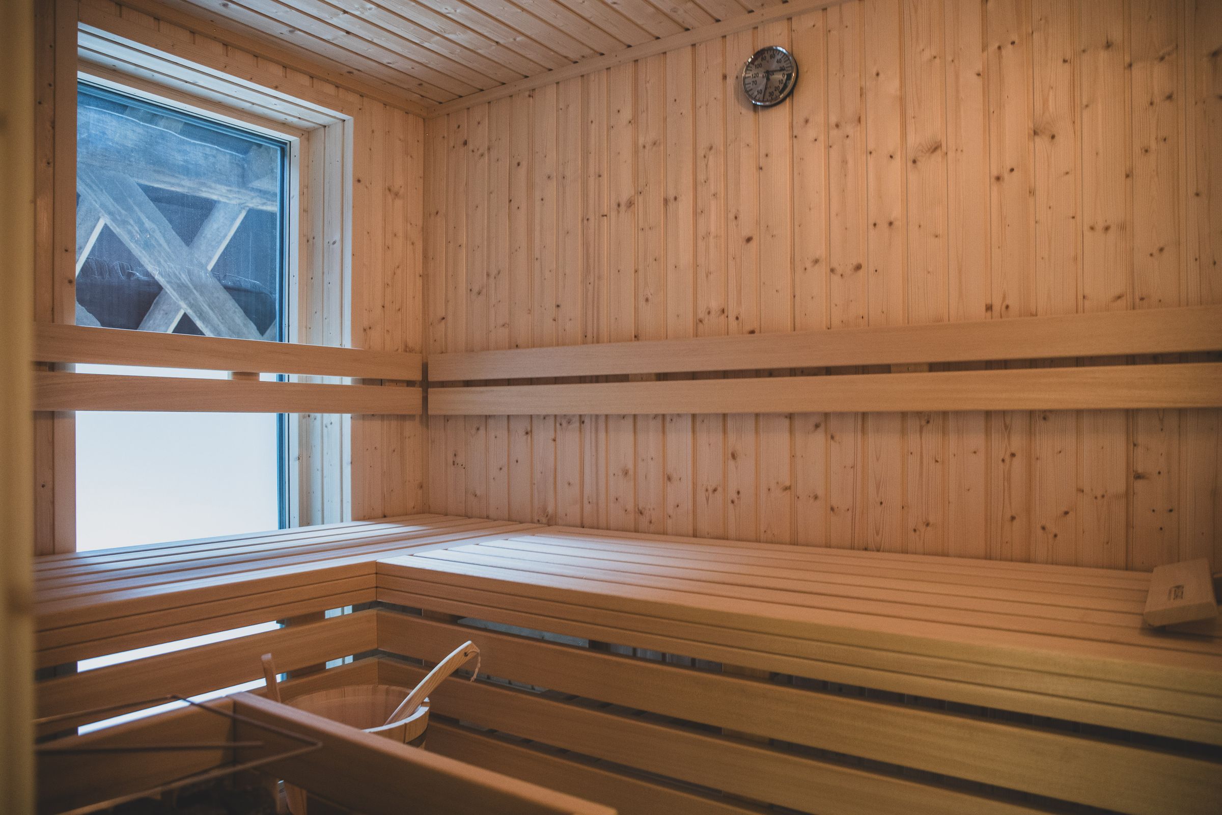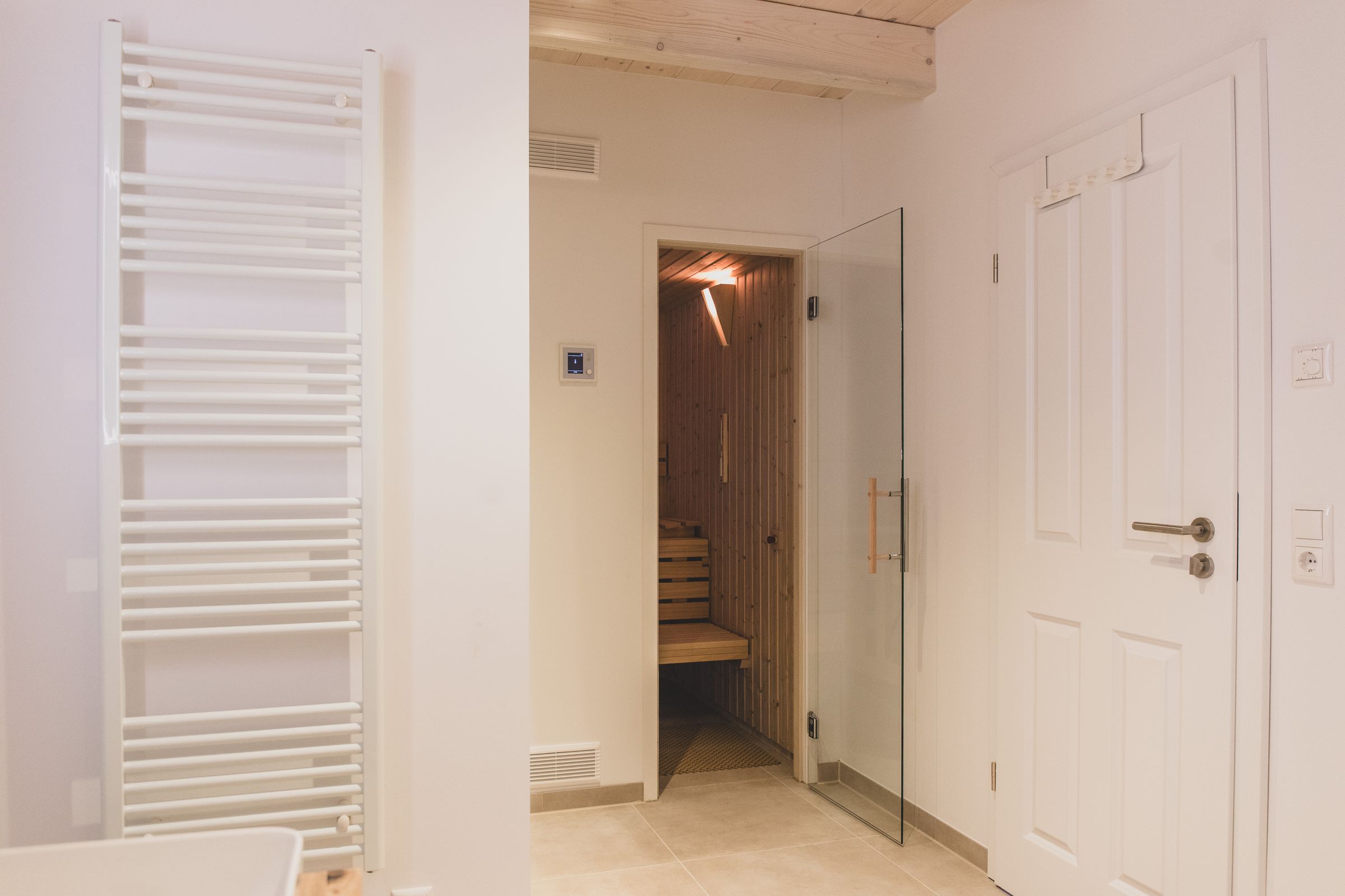 Für entspannte Stunden, lädt die eigene Sauna ein. Bei einem Glas Wein oder einem guten Buch lasst Ihr den Tag ausklingen.